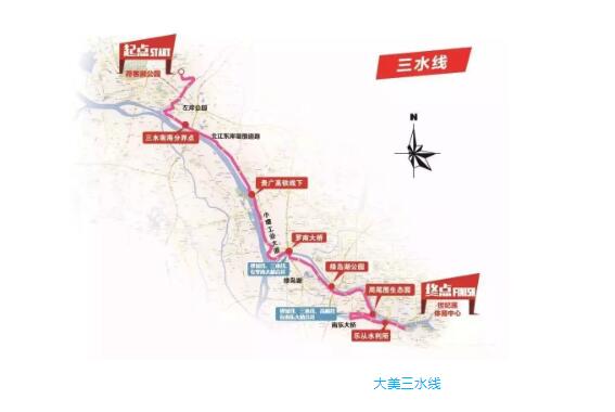 早上在現(xiàn)場激情歡騰的啟動儀式之后,隊伍從荷香湖公園出發(fā),途經水韻橋,穿經廣佛肇城軌北站動車橋底(即桃園西側),順臨江路東側人行道,往西南涌魔水光輝廣場公園,然后往三江水韻公園、紅頭巾廣場、環(huán)東路行人道、廣三高速南側單邊橋(人行橋)、右岸公園親水長廊、北江大堤,到達第一簽:三水南海分界點,行程十公里。