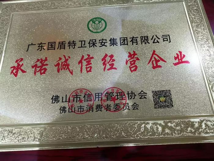 為加快推進佛山市企業信用體系建設,規范佛山市企業信用評價工作,提升佛山市各行各業的管理水平。今天上午,佛山市信用管理協會、佛山市消費者委員會向全市30多家受到社會肯定、有良好聲譽的企業頒發了《承諾誠信經營企業》牌匾。廣東國盾特衛保安集團再獲殊榮,名列其中。
