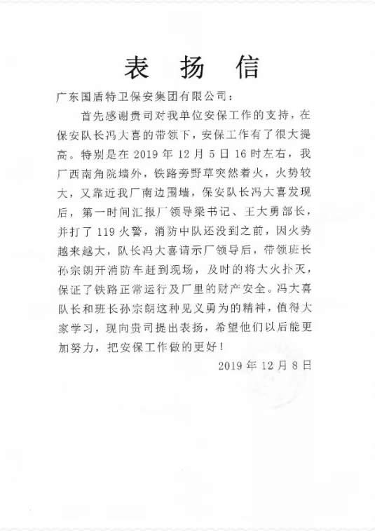 2019年12月5日下午16時許,北汽福田廠西南方向院墻外鐵路邊突然著火,我司派駐北汽福田廠保安隊長馮大喜第一時間發現火情,立即前往現場查看,并及時向廠相關部門領導上報情況和報119火警,又因火勢較大,特向廠相關部門領導請示啟用廠內消防車進行滅火。獲得批準后,隊長馮大喜帶領班長孫宗朗開消防車到現場進行滅火,防止火勢進一步蔓延。10分鐘后,專職消防隊趕到火警現場,經過聯合撲救,及時將大火撲滅。