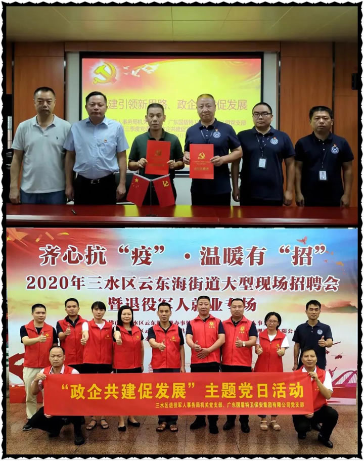 為進(jìn)一步構(gòu)建愛國擁軍平臺,凝聚社會民間資源,集團(tuán)公司黨支部書記、董事長夏學(xué)樹聯(lián)合區(qū)退役軍人事務(wù)局推動成立三水區(qū)愛國擁軍促進(jìn)會。公司注重黨員、退役軍人人才的引進(jìn)和培育,與時俱進(jìn)深化軍民關(guān)系,以黨建引領(lǐng)企業(yè)高質(zhì)量發(fā)展。為了響應(yīng)黨和政府“擁軍優(yōu)屬,擁政愛民”的號召,今年新錄用的管理層人員大多數(shù)為退役軍人,其中有4名為中共黨員。一直以來,集團(tuán)公司致力推進(jìn)融合式黨建工作,將企業(yè)文化融入愛國主義和革命傳統(tǒng)教育,匯聚紅色力量,激發(fā)保安員的愛國熱情,增強(qiáng)新時代責(zé)任擔(dān)當(dāng),確保每年發(fā)展1-2名黨員,不斷充實(shí)企業(yè)發(fā)展和黨組織力量。