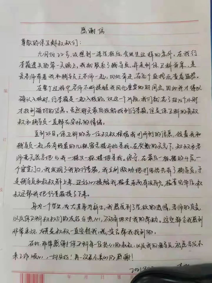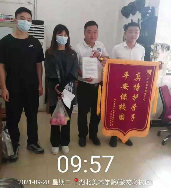 2021年9月28日早上,集團(tuán)湖北分公司駐湖北美術(shù)學(xué)院項(xiàng)目部值班室收到來自國畫系學(xué)生送來一面錦旗以及一封親筆書寫的感謝信。該學(xué)生為感謝我司駐項(xiàng)目經(jīng)理岳凌同志過去幾天幫助同學(xué)找回丟失的行李,特意親自遞上水果作為答謝心意,被岳凌經(jīng)理禮貌婉拒。岳經(jīng)理接過錦旗后表示這是一件很平常的小事,我們駐守校園的初心就是全心全意為校園師生服務(wù),堅(jiān)持做好自己的本職工作。