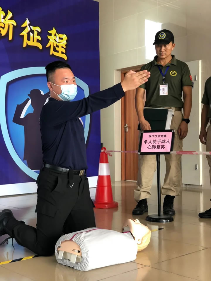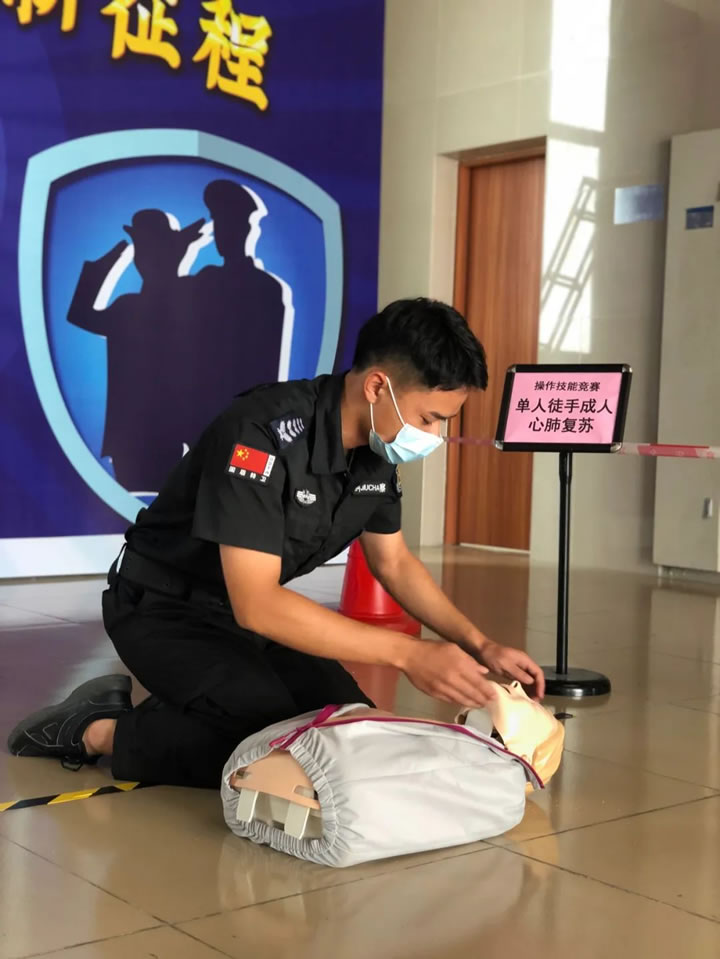 該競賽分為理論知識(shí)考核和實(shí)操技能考核兩部分。其中,實(shí)操技能考核,包括隊(duì)列基本動(dòng)作、現(xiàn)場救護(hù)技能(單人徒手成人心肺復(fù)蘇)、消防技能(滅火器使用)三項(xiàng)。